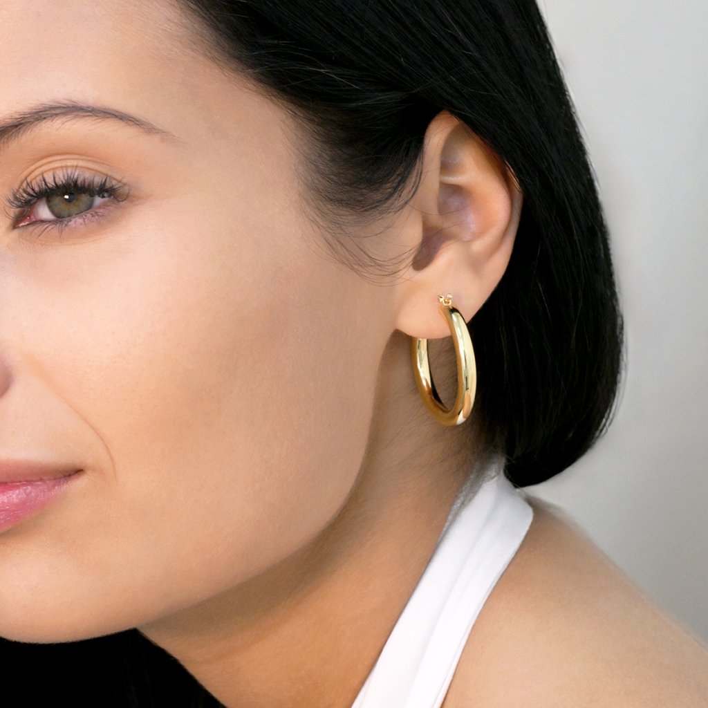 Náušnice 91A00089 zhotovené ze 14karátového zlata nabízejí klasický tvar kruhů o průměru 30 mm, který dodává šperku sebevědomou eleganci. Jejich minimalistický design umožňuje snadné kombinování s různými styly oblečení. Pohodlné zapínání na francouzský zámek. Tloušťka kruhu je 4,3 mm.