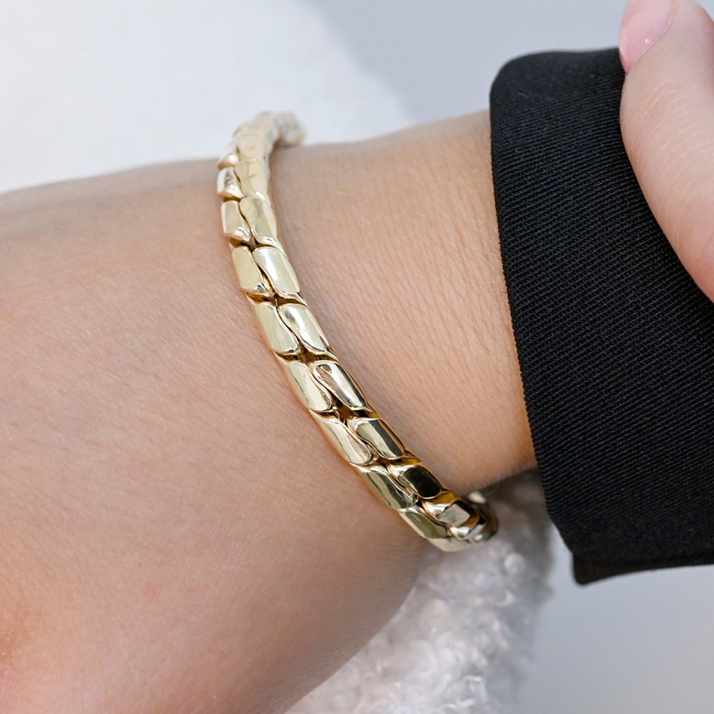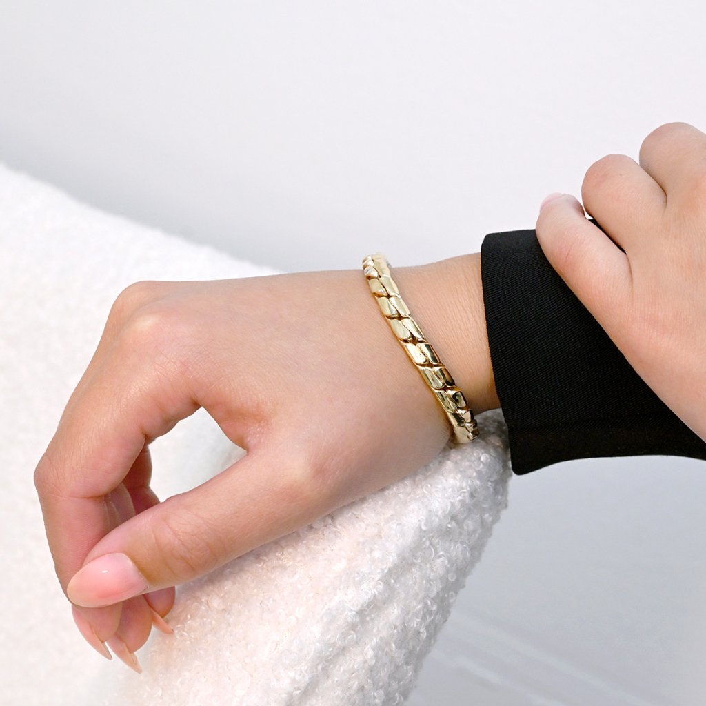 Jeho precizně a jemně zaoblené články, které do sebe elegantně zapadají vytvářejí harmonickou linii, která se krásně leskne při každém pohybu. Náramek působí luxusně a zároveň dokonale ladí s moderním i tradičním stylem.