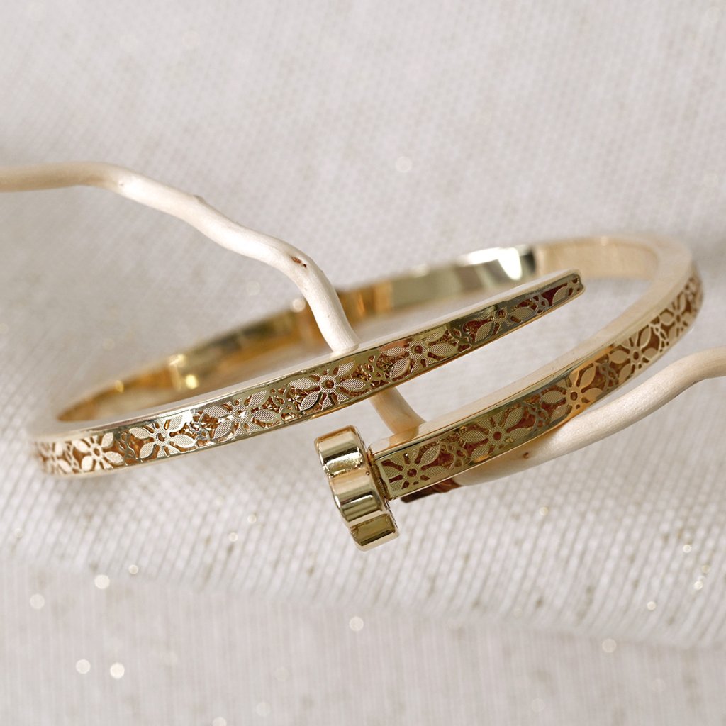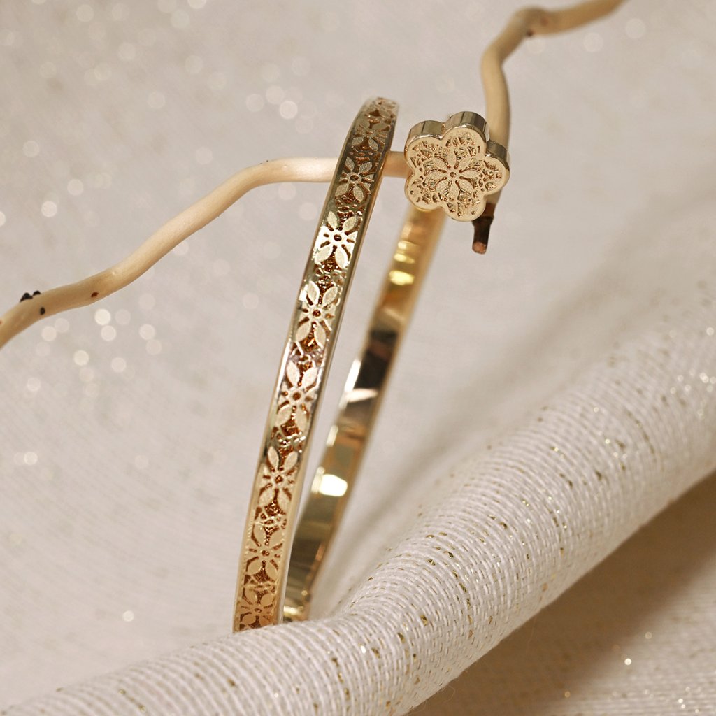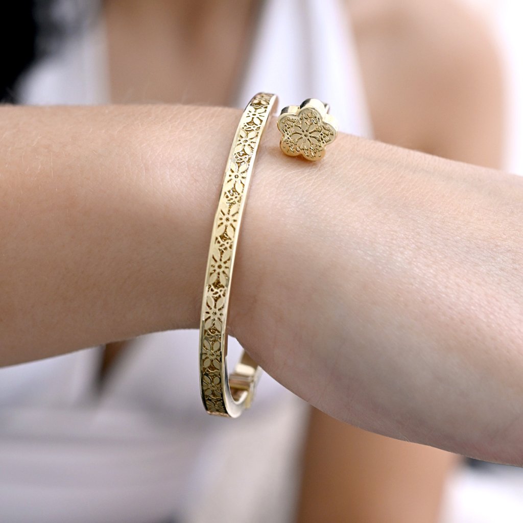 Elegantní náramek z pravého 14karátového zlata zaujme svým jemným květinovým gravírováním, které mu dodává luxusní a zároveň nadčasový vzhled.