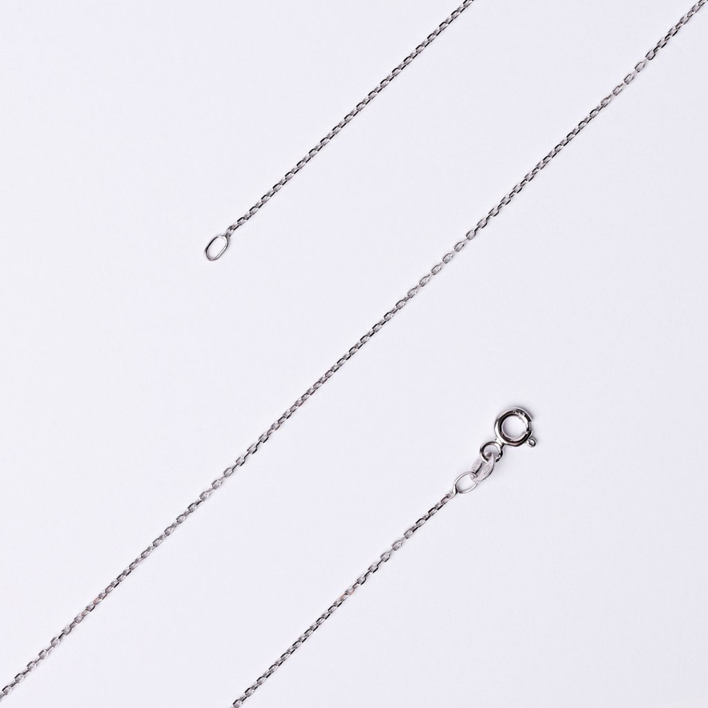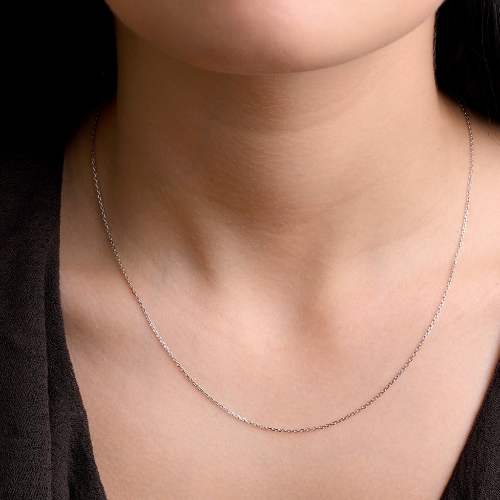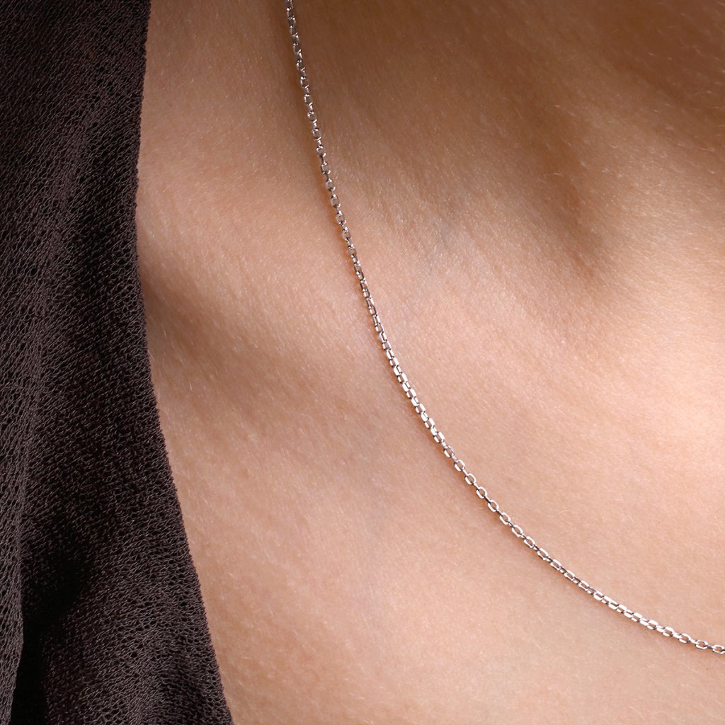 Tenký řetízek je vyrobený z bílého 14kt zlata. Řetízek tvoří zbroušená očka, díky kterým se řetízek krásně leskne. Sluší mu zejména drobné minimalistické přívěsky.