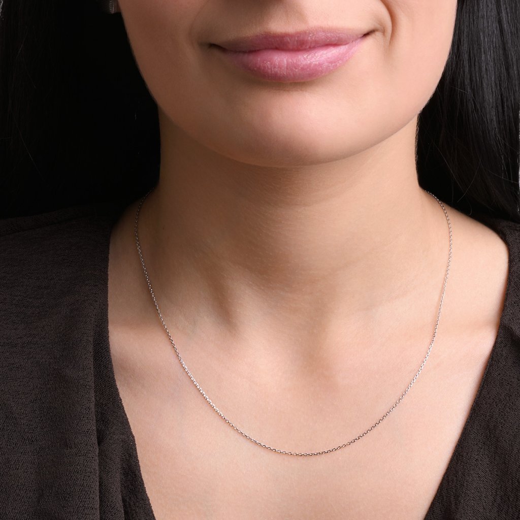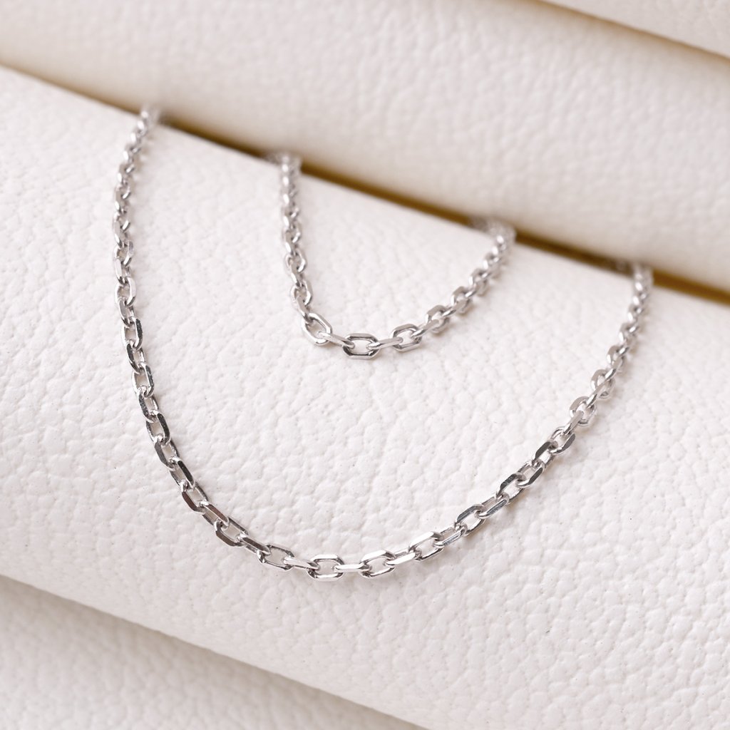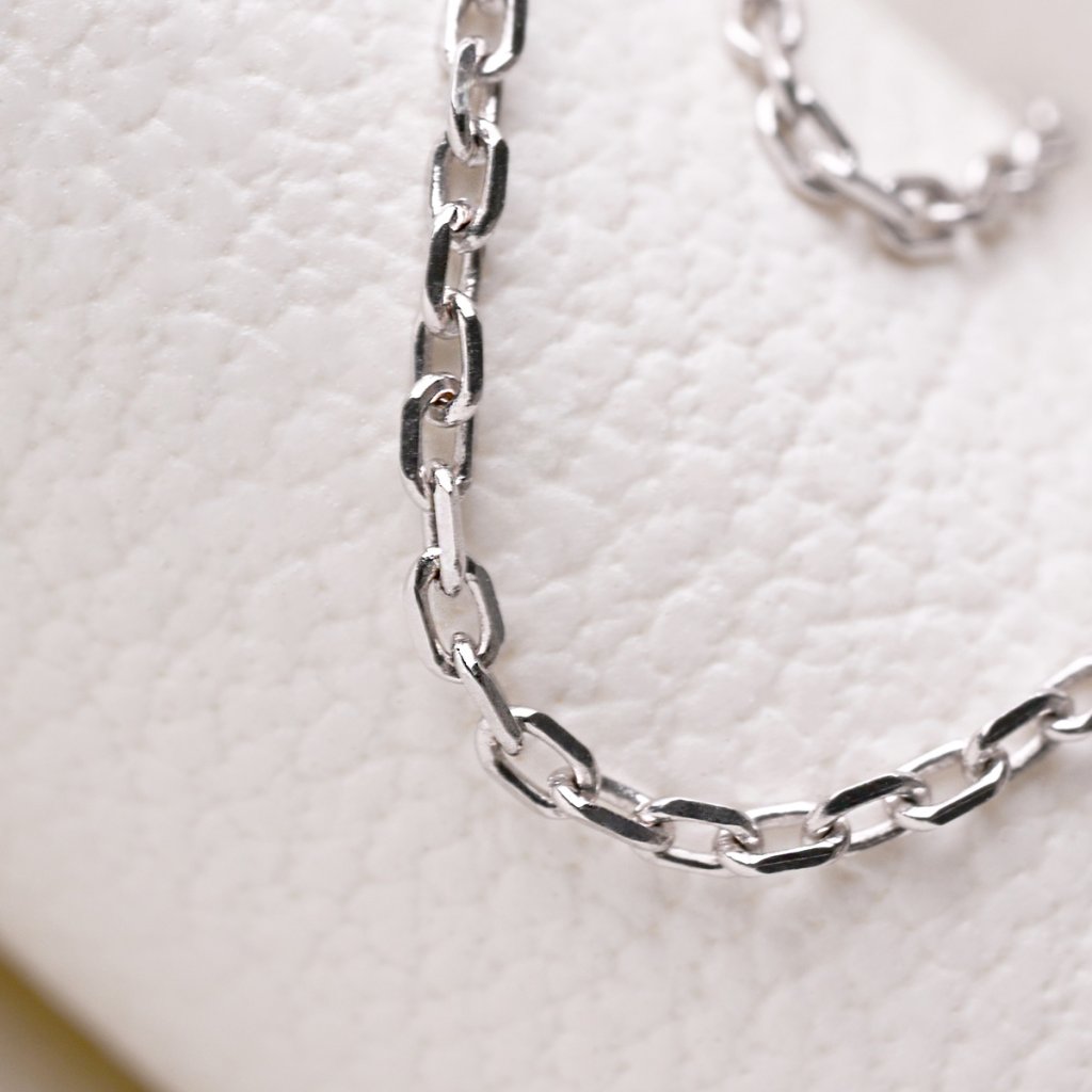 Tenký řetízek je vyrobený z bílého 14kt zlata. Řetízek tvoří zbroušená očka, díky kterým se řetízek krásně leskne. Sluší mu zejména drobné minimalistické přívěsky.