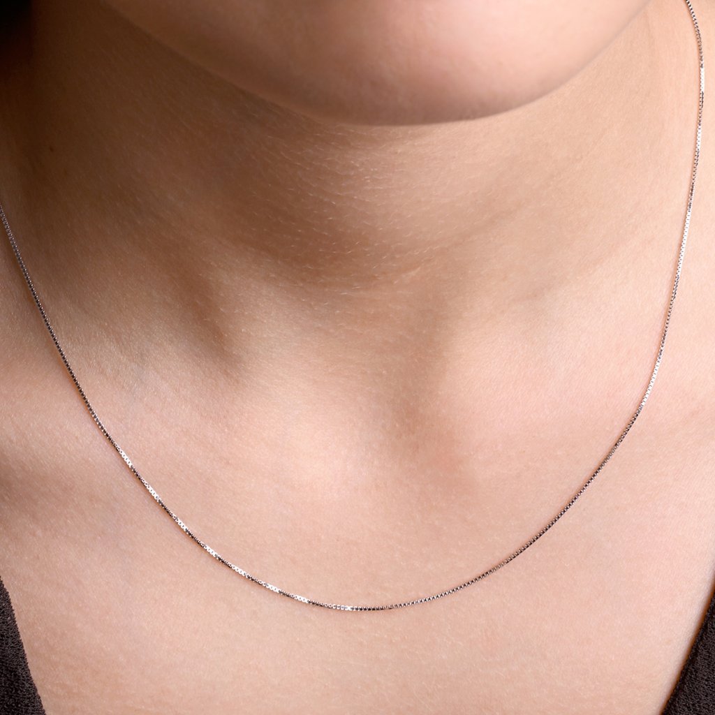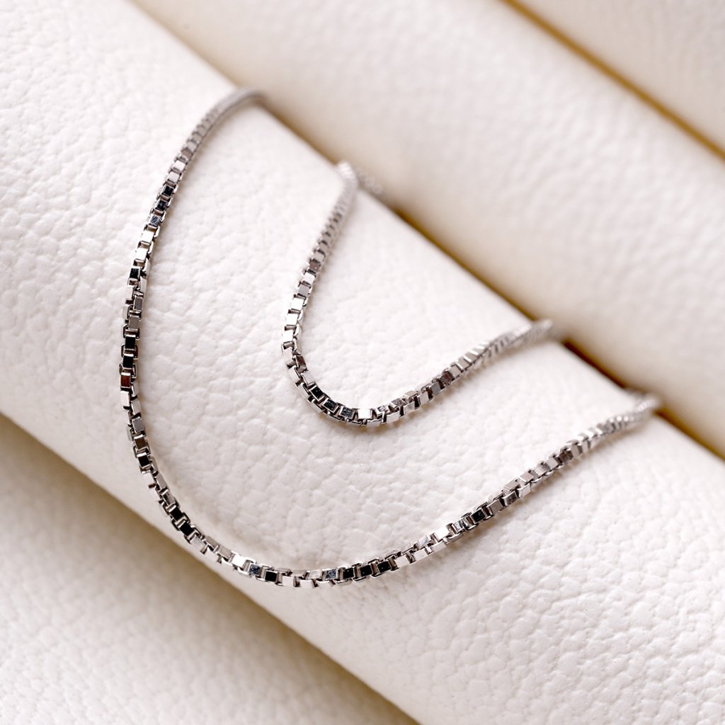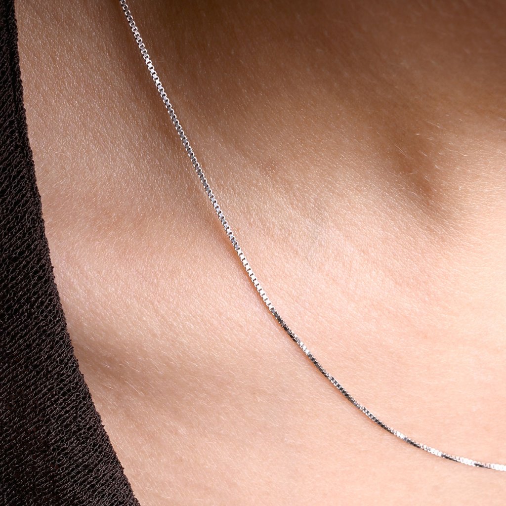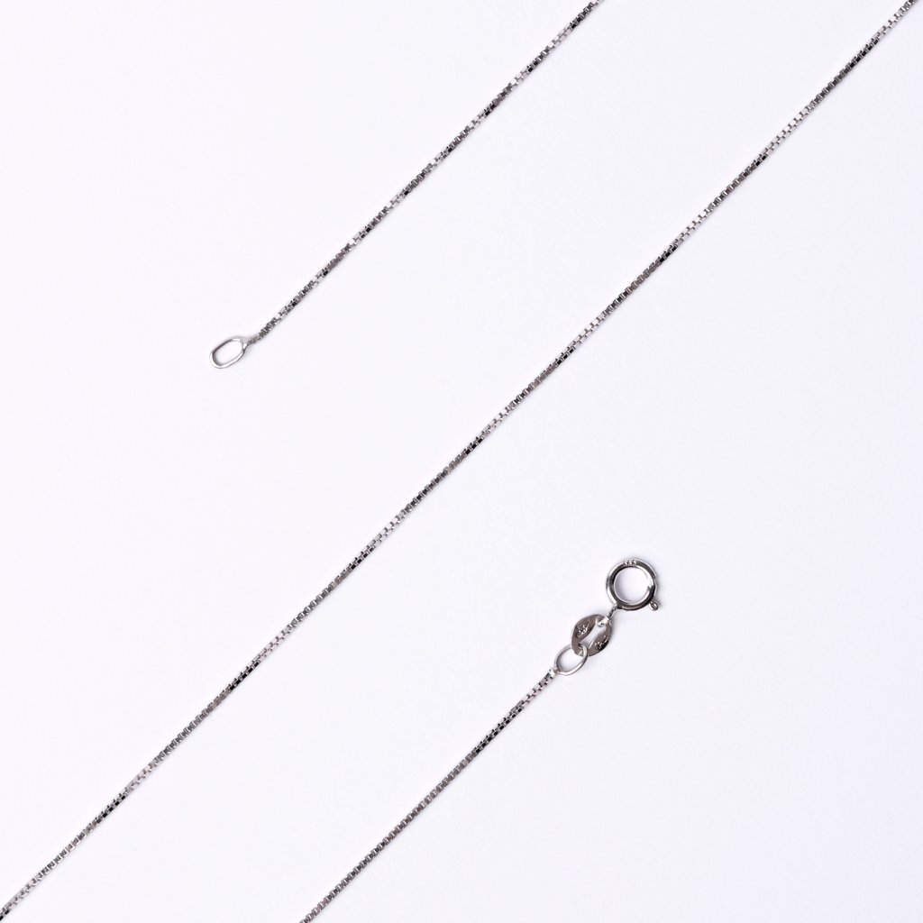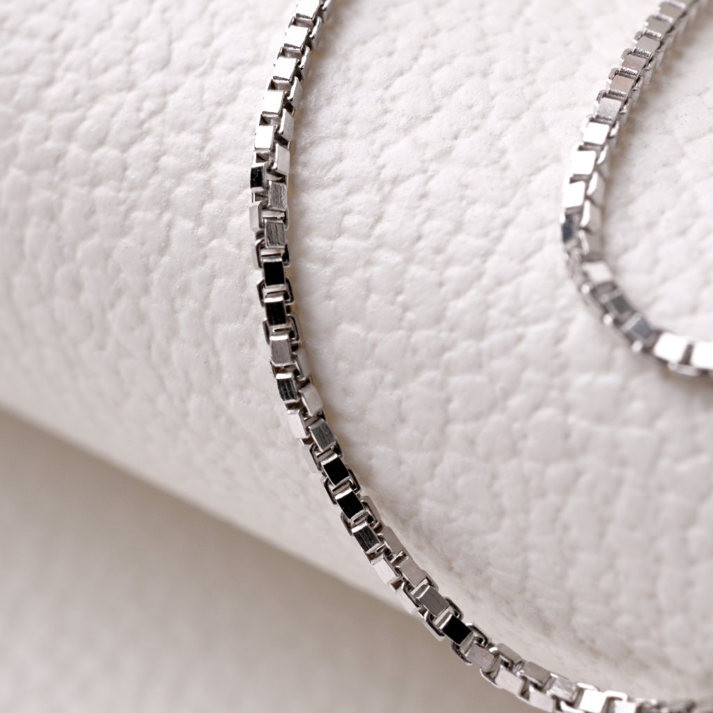 Tenký řetízek je vyrobený z bílého 14kt zlata. Řetízek tvoří zbroušené kostičky, díky kterým se řetízek krásně leskne. Sluší mu zejména drobné minimalistické přívěsky.