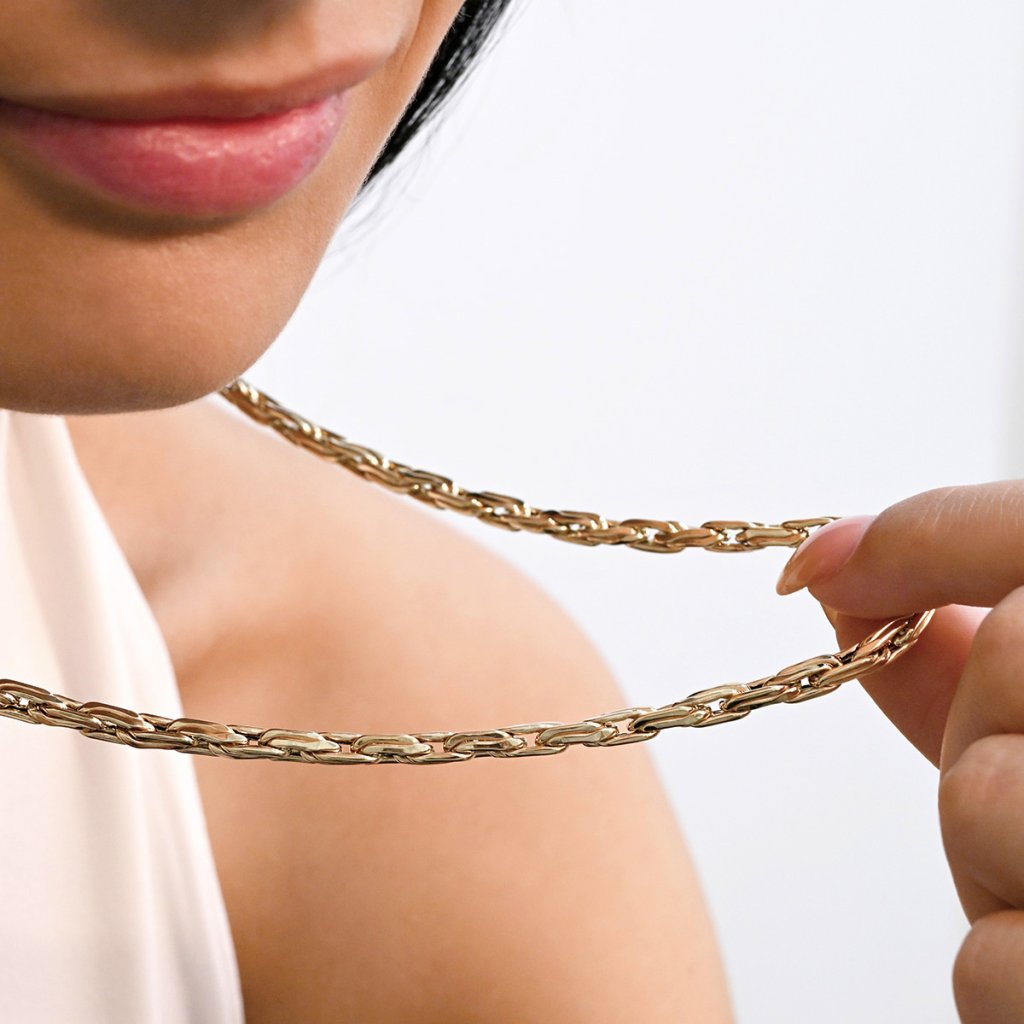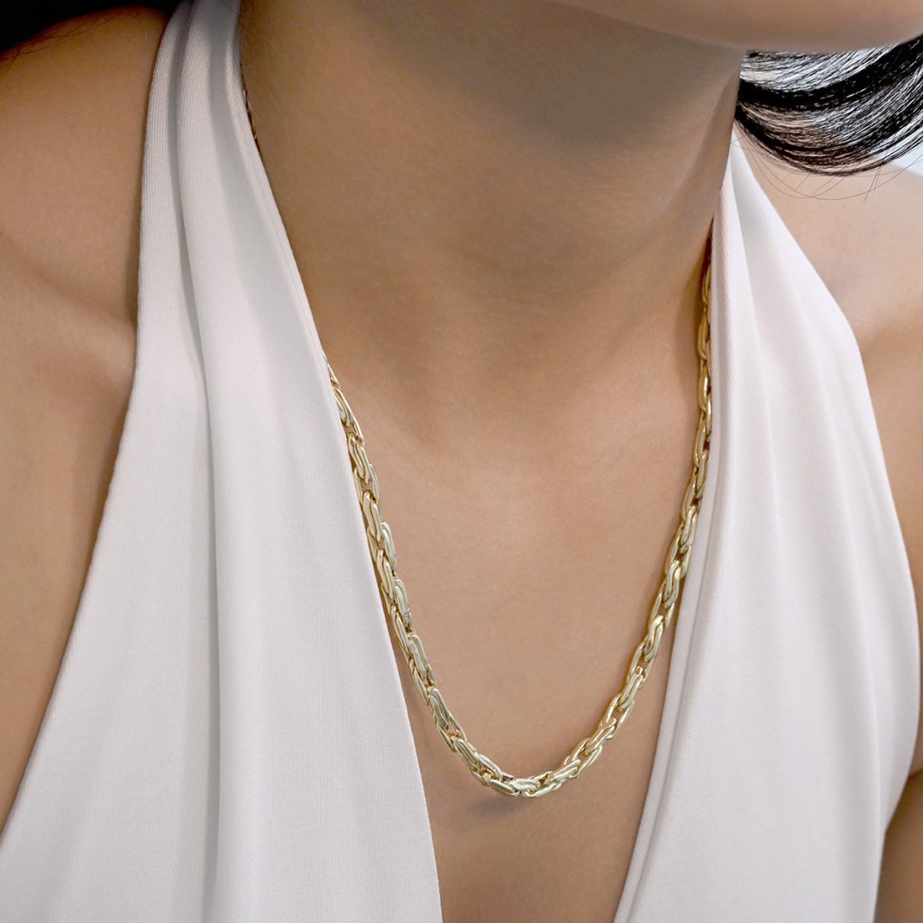 Každý článek je pečlivě tvarovaný tak, aby zachytil světlo z každého úhlu a vytvořil nádherný lesk, který okamžitě upoutá pozornost. Náhrdelník působí plně, pevně a kvalitně – je to typ šperku, který se stane nadčasovým kouskem ve vaší sbírce.