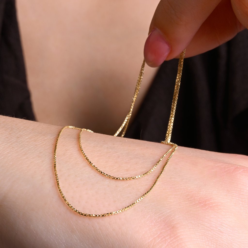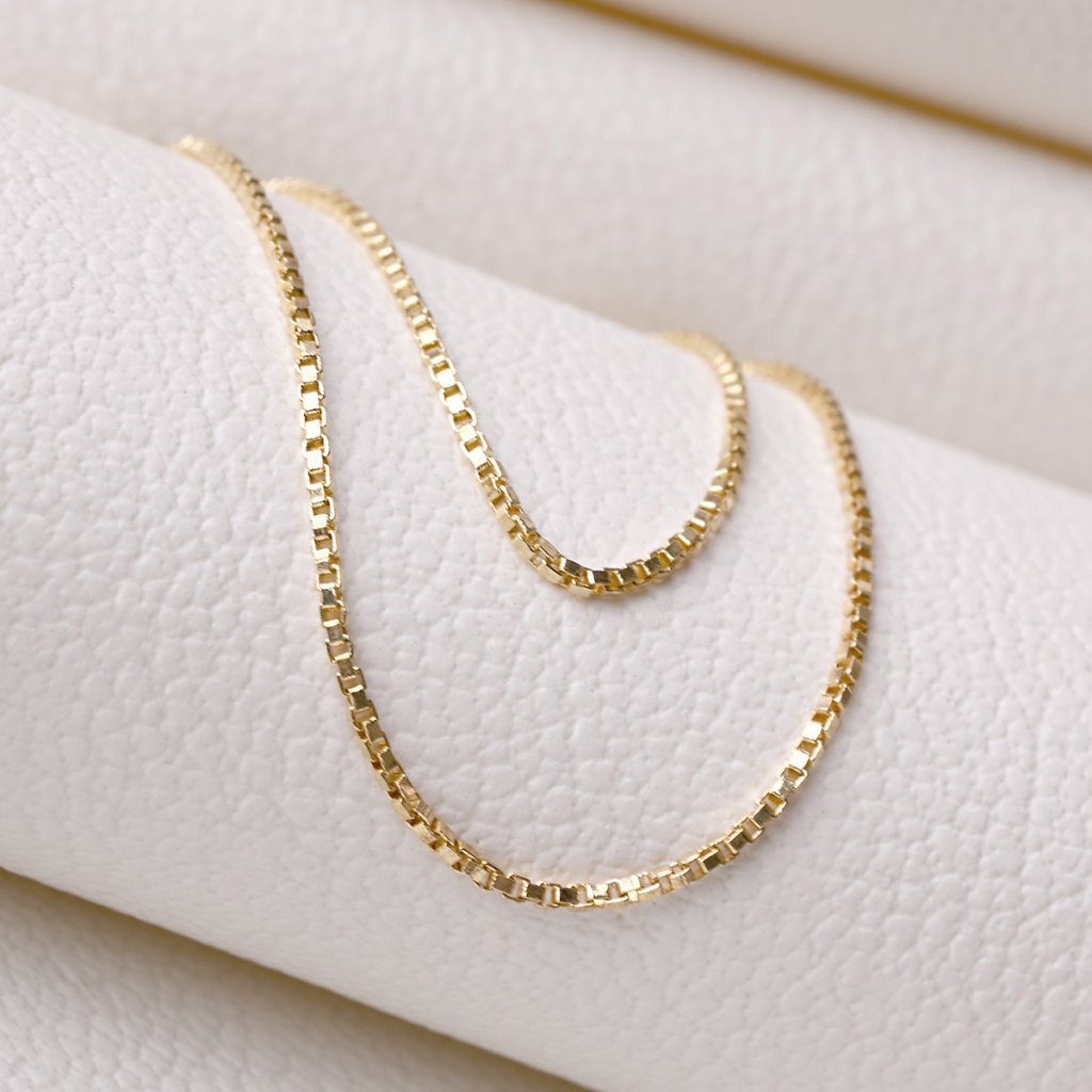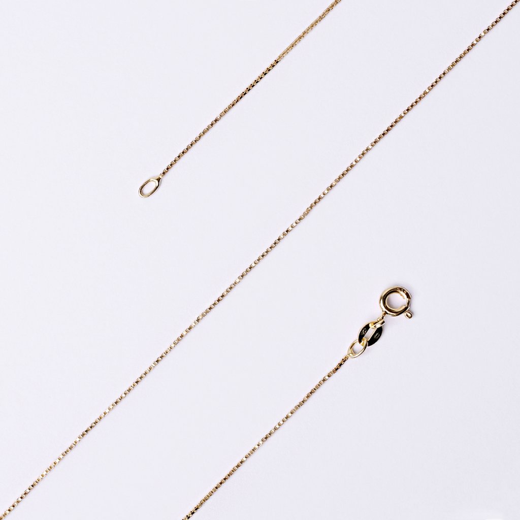 Tenký řetízek je vyrobený ze žlutého 14kt zlata. Řetízek tvoří zbroušené kostičky, díky kterým se řetízek krásně leskne. Sluší mu zejména drobné minimalistické přívěsky.