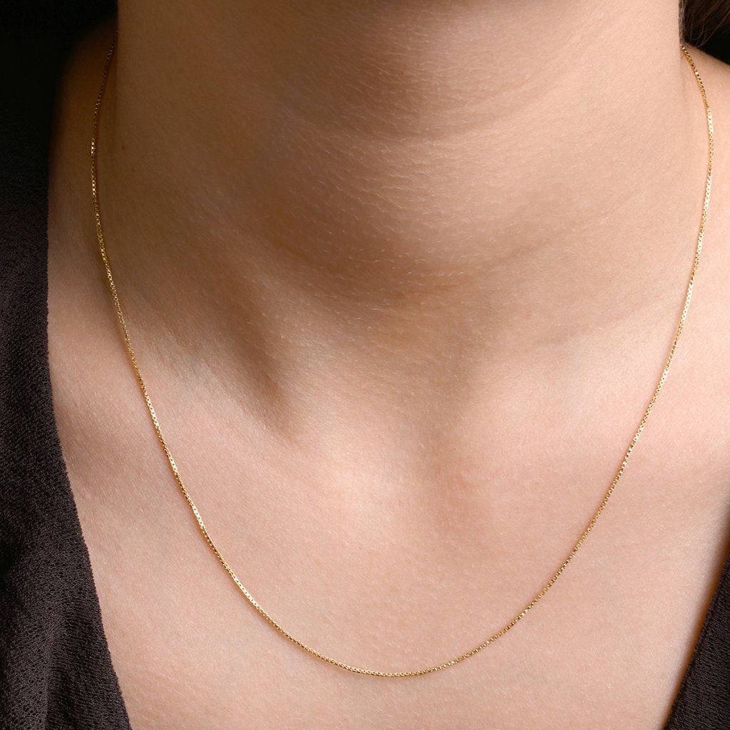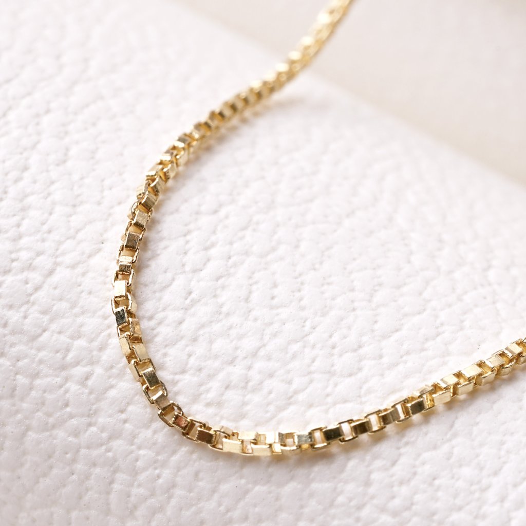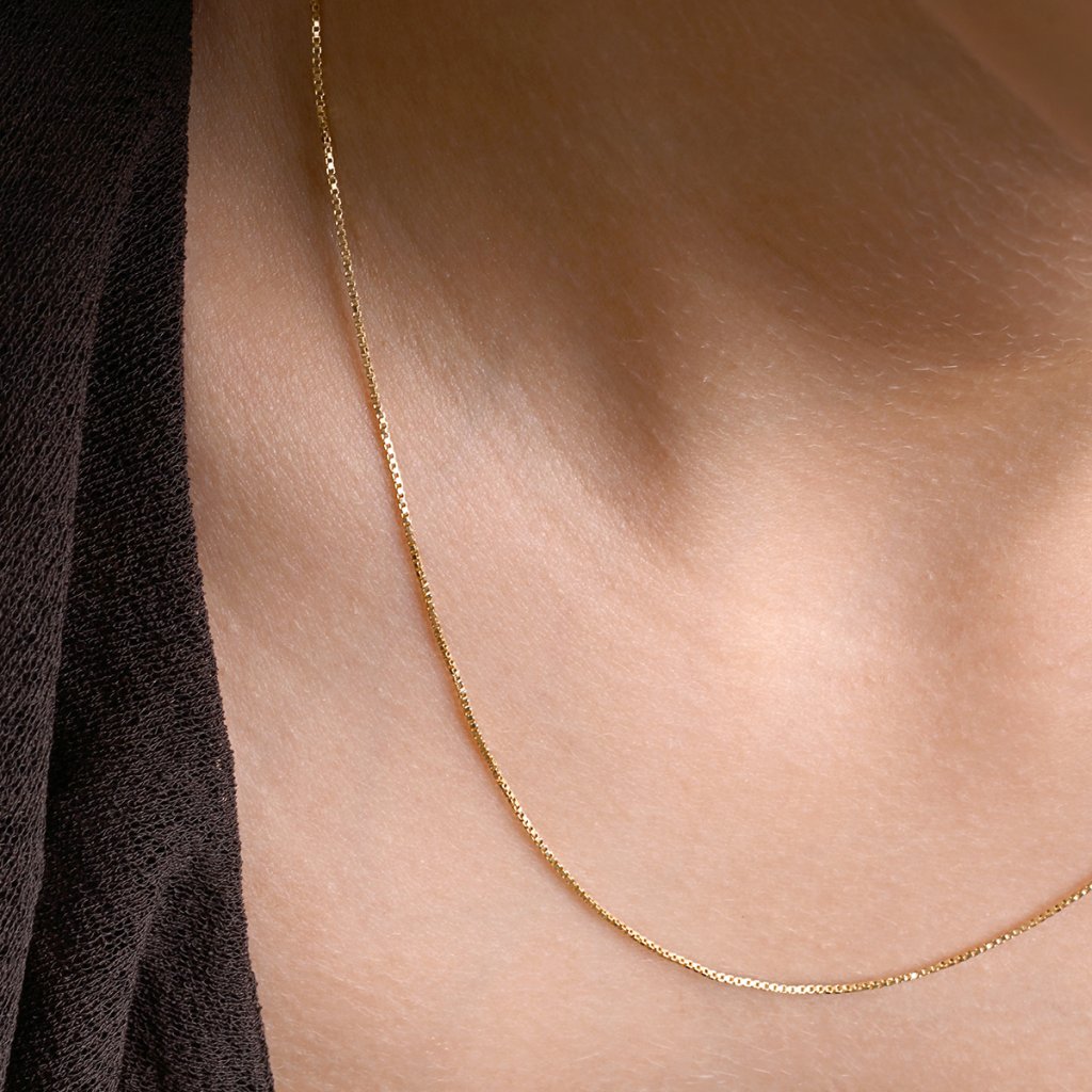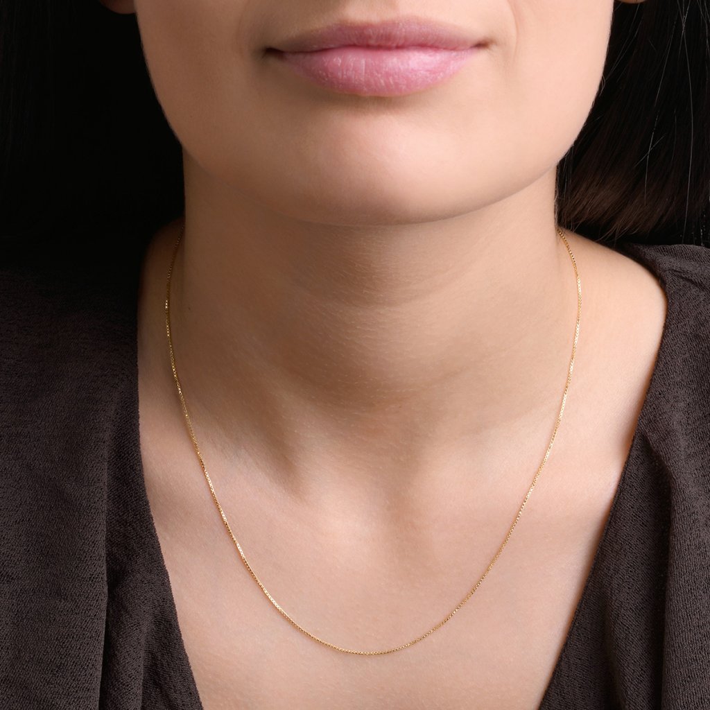 Tenký řetízek je vyrobený ze žlutého 14kt zlata. Řetízek tvoří zbroušené kostičky, díky kterým se řetízek krásně leskne. Sluší mu zejména drobné minimalistické přívěsky.